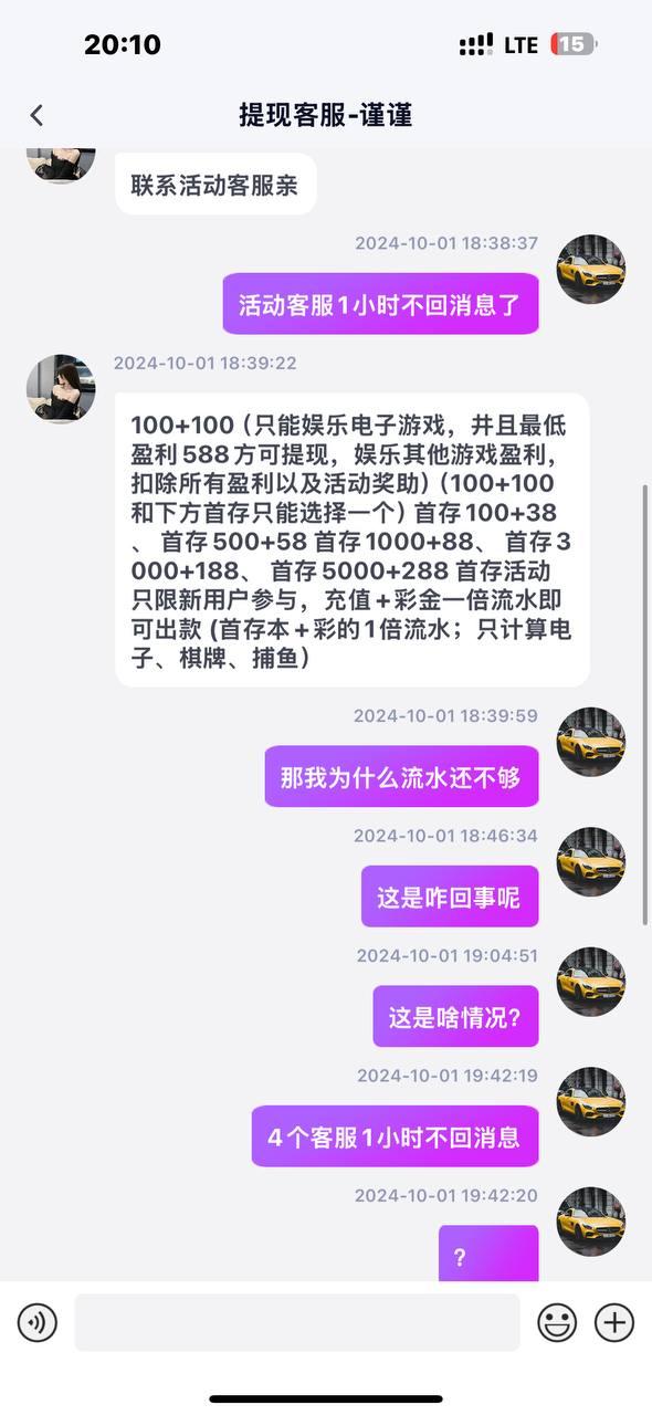 说是首存100+100一杯流水盈利588即可提现。我打到590提现显示差流水,客服说要盈利588,我又打到710提现还是不给出,各种理由不给出款,黑台大家避雷